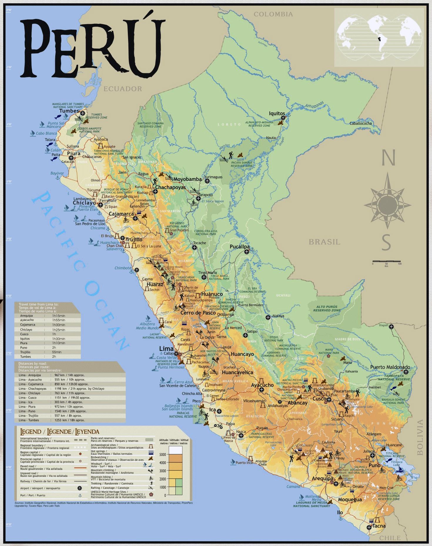 Карта на Перу пътуване. Карта за пътуване в Перу (Южна Америка - Америка) за печат. Карта за пътуване в Перу (Южна Америка - Америка на изтегляне.